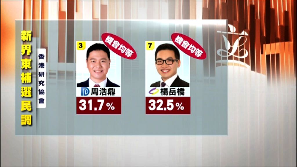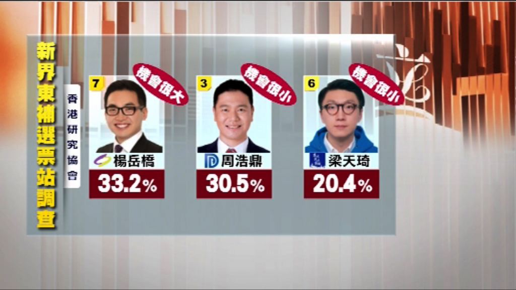 【now新聞台】香港研究協會的票站調查顯示,民建聯周浩鼎及公民黨楊岳橋勝出機會均等。