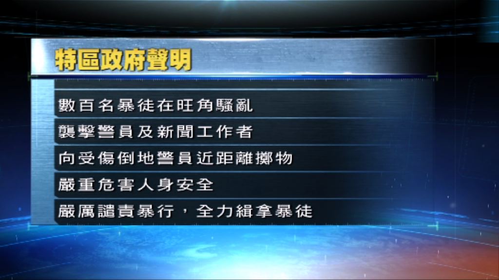 【now新聞台】特區政府發表聲明,指凌晨開始有至少數百名暴徒在旺角騷亂,襲擊警務人員及在現場採訪的新聞工作人員,毁壞警車及公物、縱火,向被襲受傷倒地的警員近距離投擲磚頭和雜物,嚴重危害執行任務的警務人員及其他在場人士人身安全。