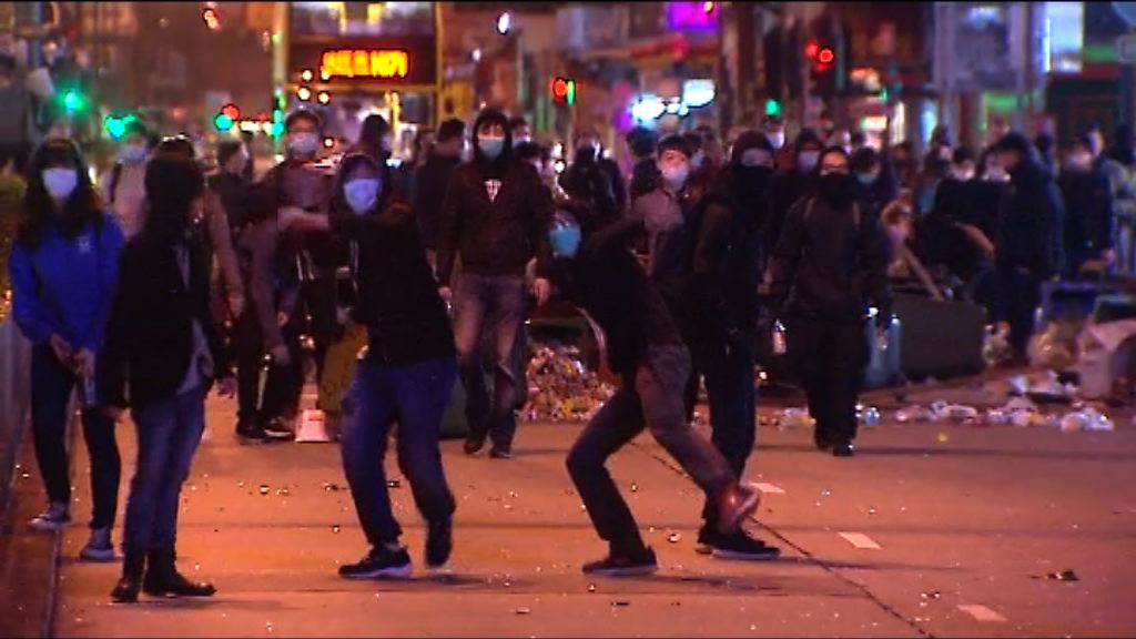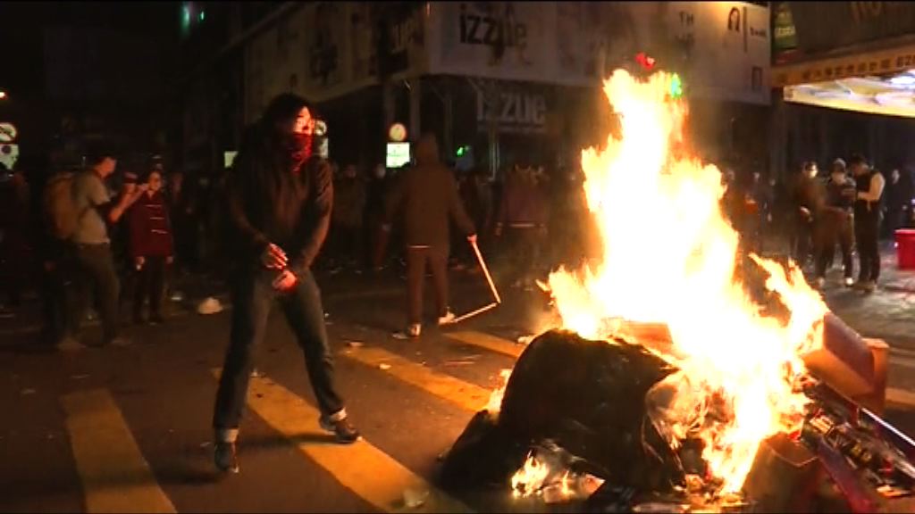 【now新聞台】旺角騷亂直至凌晨仍未結束,群眾在旺角聚集,多處地方有人縱火焚燒雜物,又向警員投擲磚磈,警方配備盾牌及頭盔,防線多次失守。