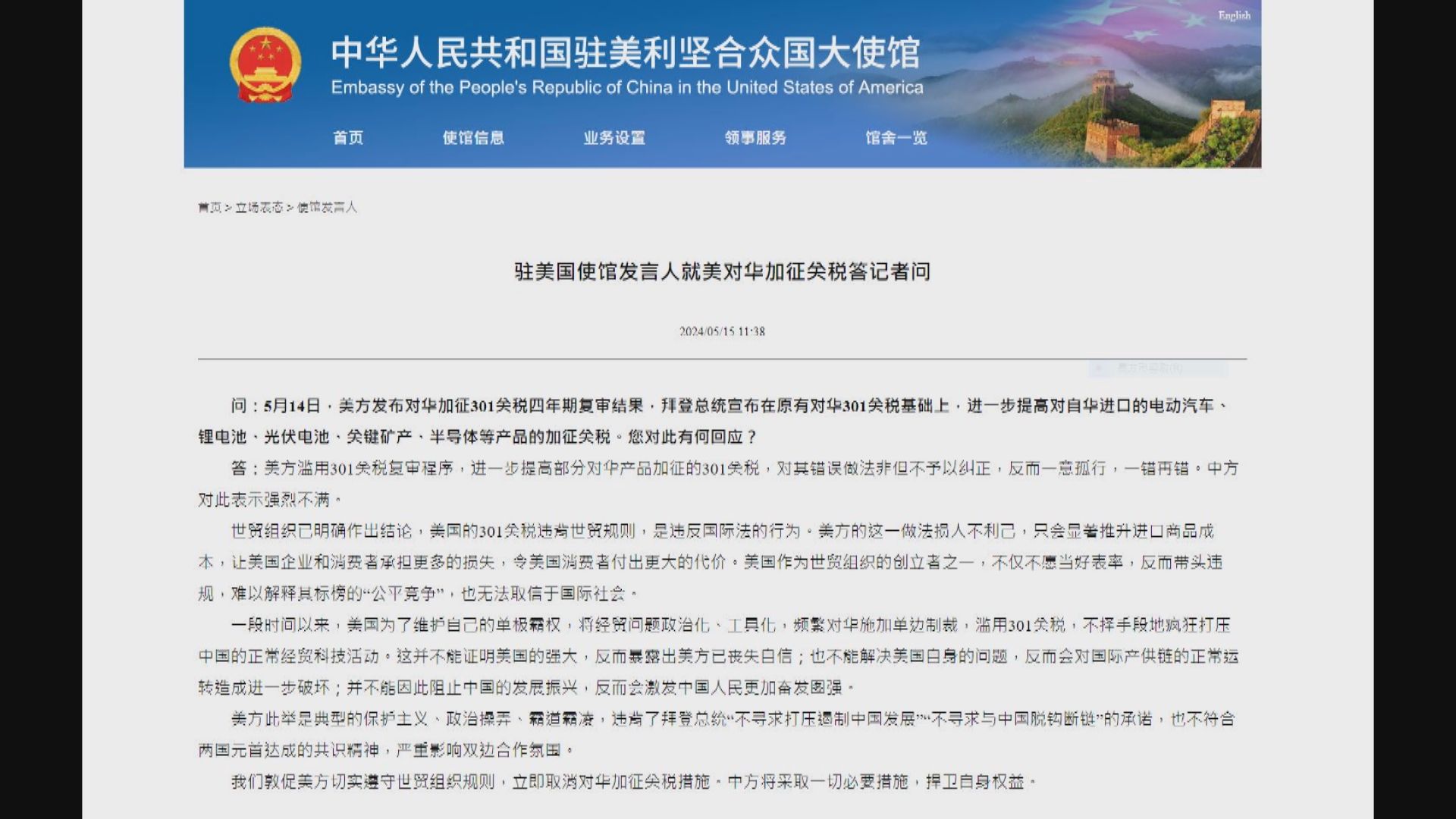 【Now新聞台】中國駐美大使謝鋒表示,美國日前宣布對中國貨物加徵關稅,真實目的是打壓中國新能源等產業,遏制中國高質量發展。