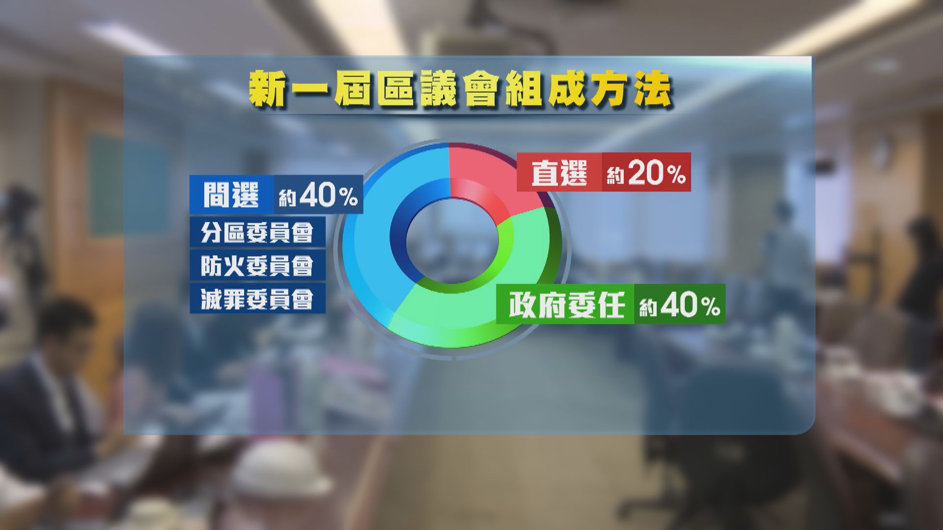 【Now新聞台】消息指,區議會選舉組成將會改變,建議方案是直選議席佔整體約兩成,間選及委任各佔約四成,並設提名制及資格審查制,最快星期二公布。