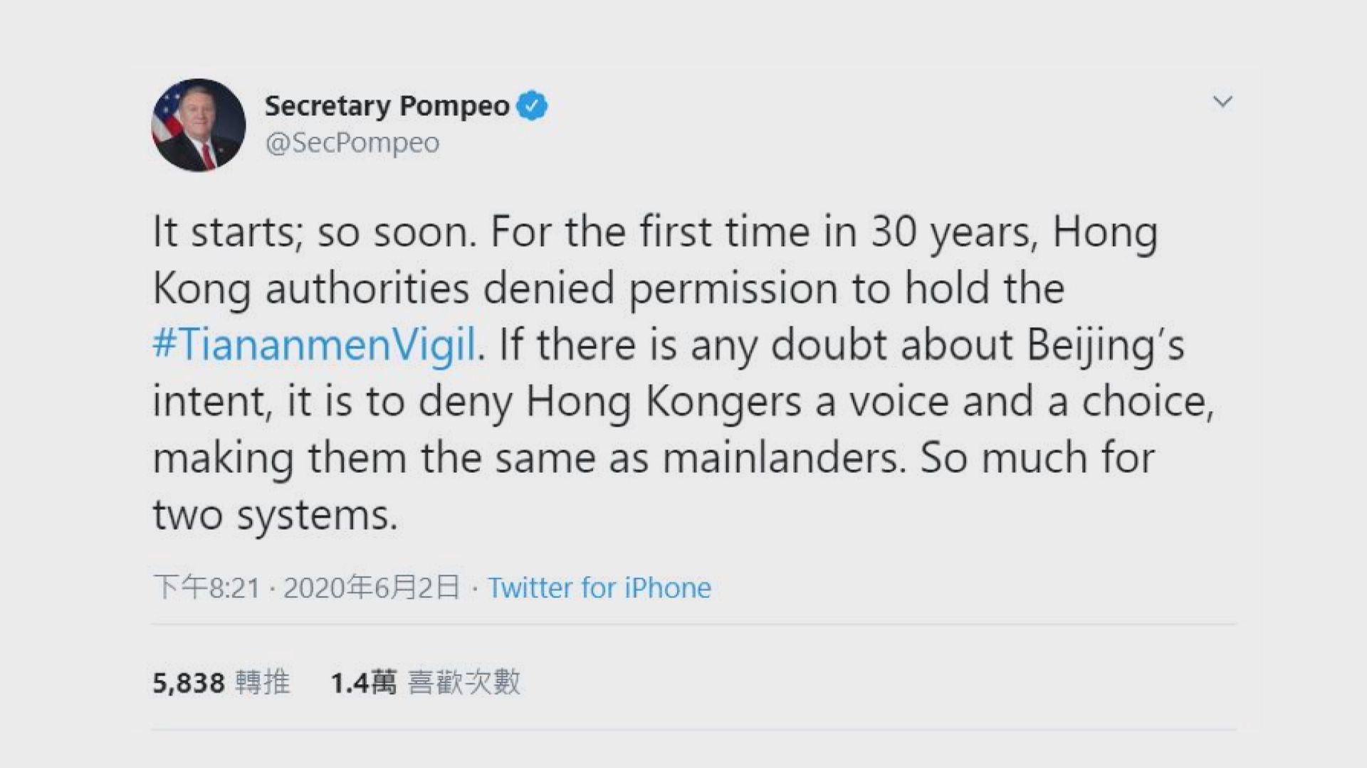 【Now新聞台】美國國務卿蓬佩奧批評特區政府拒絕批准六四當晚在維園舉行燭光集會。