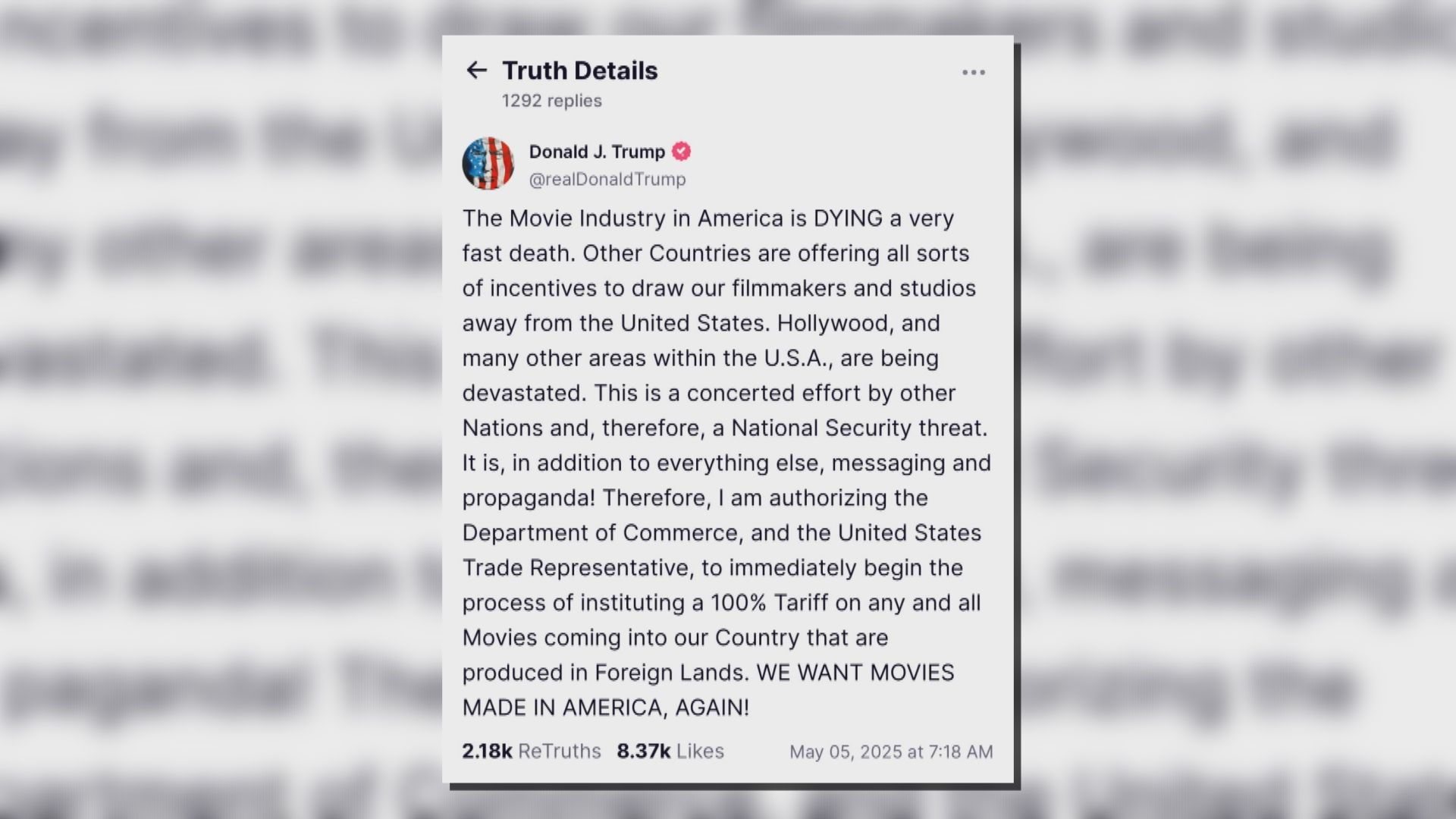 【Now新聞台】美國總統特朗普宣布,對美國境外製作的電影徵收百分百關稅。