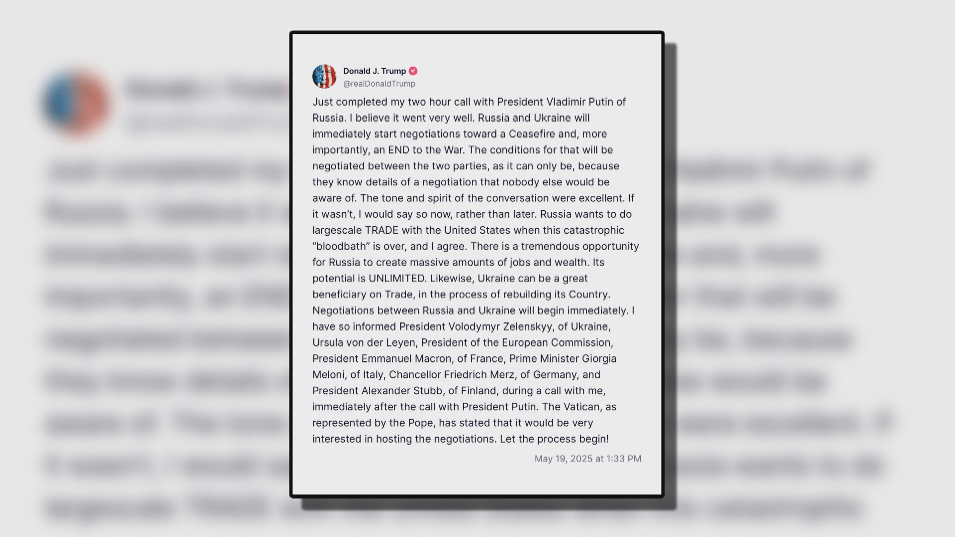 【Now新聞台】美國總統特朗普表示,他周一將會分別與俄羅斯總統普京及烏克蘭總統澤連斯基通話。俄烏代表團日前在土耳其的談判,未能就停火達成協議,而談判結束後數小時,烏克蘭再遭俄軍空襲,至少9人死亡。