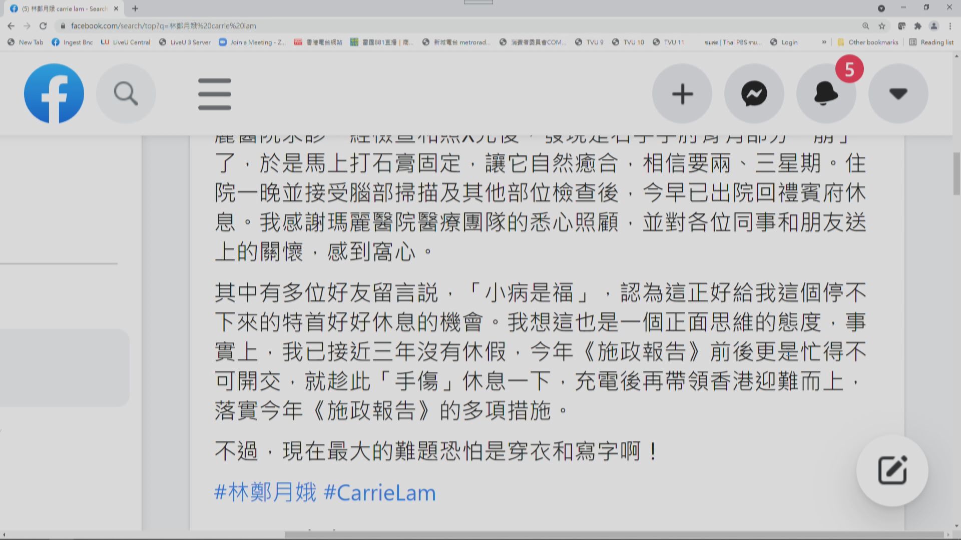 【Now新聞台】因右手手肘輕微骨折要休假的行政長官林鄭月娥,明日恢復公務。