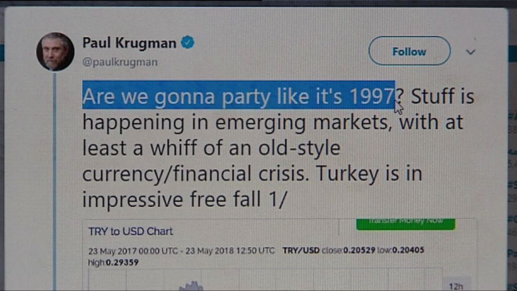 【Now新聞台】土耳其貨幣里拉大幅貶值引發貨幣危機,當地央行緊急加息3厘,消息一出,里拉於紀錄低位反彈。不過,諾貝爾經濟學獎得主克魯明警告,在新興市場危機下,1997年爆發的亞洲金融風暴有機會重演。