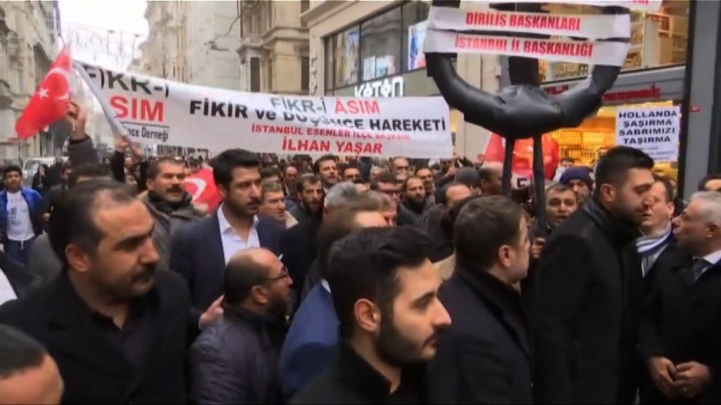 【Now新聞台】土耳其就修憲公投與荷蘭爆發的外交風波升級,荷蘭先後拒絕土耳其外長及另一名部長到當地出席集會,引發土耳其僑民與警方衝突,荷蘭警方拘捕12人。土耳其總統埃爾多安指,荷蘭要為損害兩國關係付出代價,但荷蘭首相呂特指,不會容許土耳其勒索。