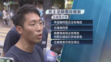 【Now新聞台】民主派顛覆政權案,參選新界西初選的被告開始求情,其中伍健偉親自求情指,犯案並非出於私利,案發時不知否決財政預算案可能違法;而張可森則指,因不能陪伴妻兒而感沮喪,已深切反省。