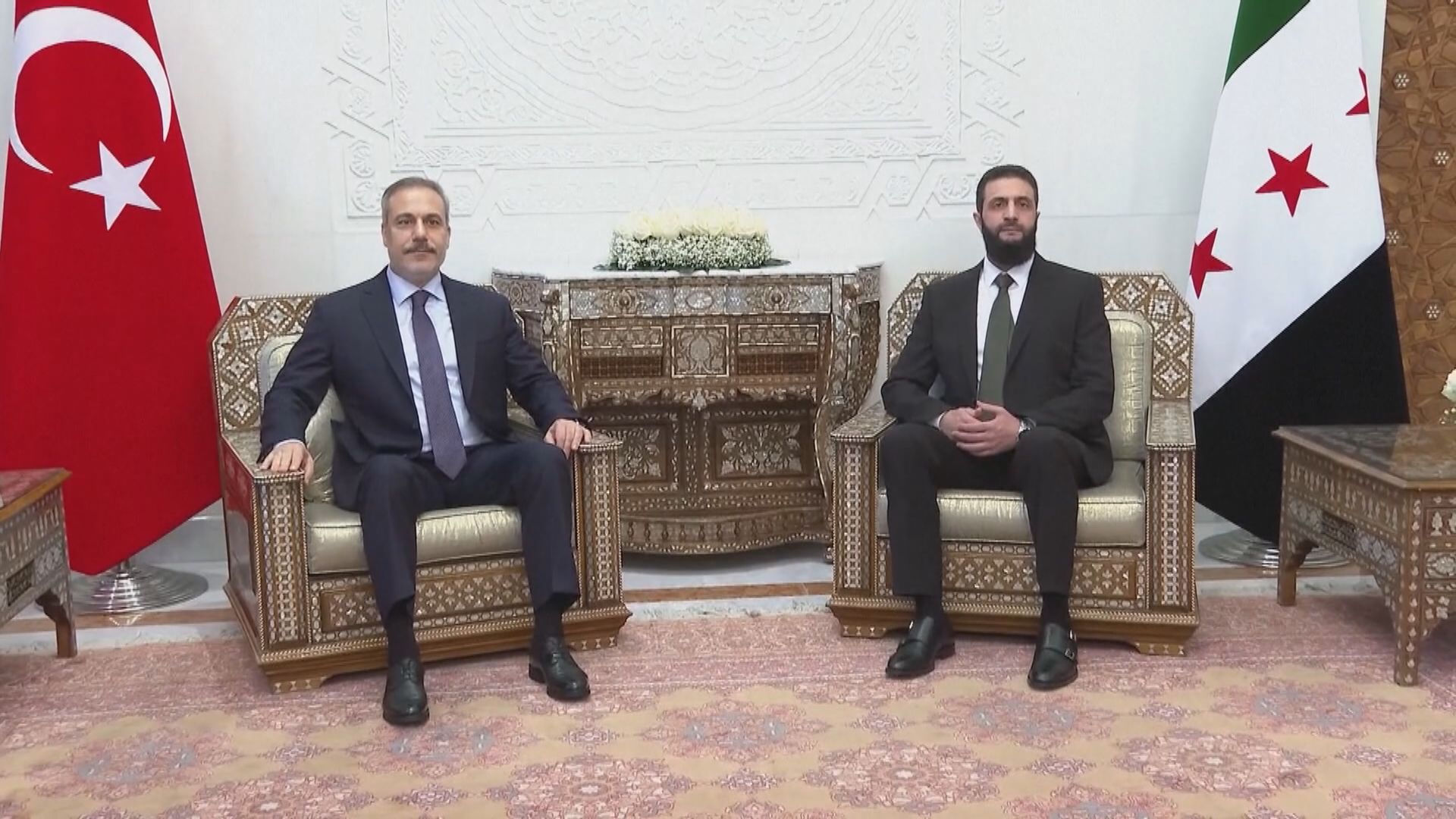 【Now新聞台】土耳其外長費丹訪問敘利亞與沙姆解放組織領袖沙拉會面,他呼籲國際社會盡快結束對敘利亞的制裁。脫下軍服換上西裝的沙拉,周日在首都大馬士革與到訪的費丹舉行會談,費丹是巴沙爾政權倒台後,首位到訪當地的外長。