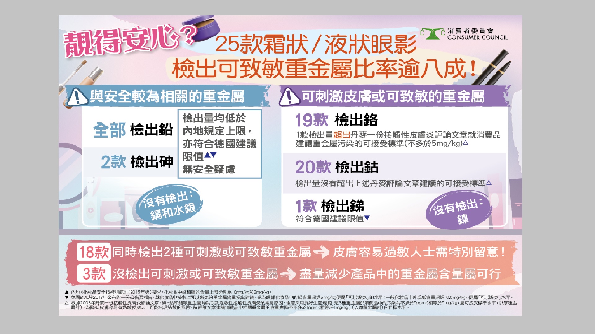 【Now新聞台】眼影產品深受女士歡迎,消委會檢測25款霜狀/液狀眼影樣本,標榜具持妝效果,發現全部樣本均含鉛小量,2款含砷,雖沒安全疑慮,不過逾8成樣本檢出重金屬,可致皮膚過敏,要格外留神。本台整理各項產品總評,供消費者參考。