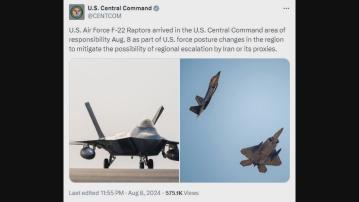 【Now新聞台】中東局勢持續緊張。據報,美國警告伊朗如果對以色列發動重大襲擊,將面臨嚴重風險。因應區內局勢可能進一步升級,美國派出F22猛禽戰機到中東。