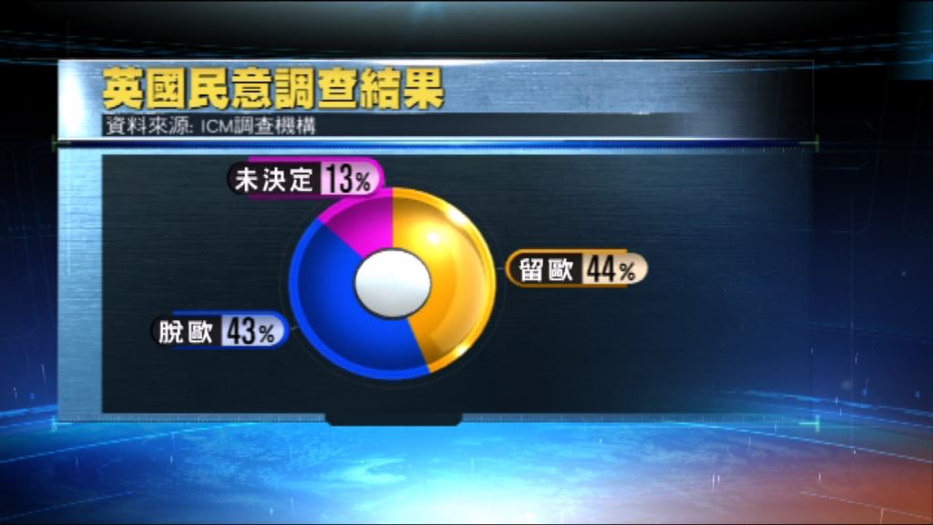 【now新聞台】英國下月舉行公投,決定是否脫離歐盟,脫歐及留歐陣營分別繼續游說民眾支持。最新民調顯示,兩邊陣營的支持度仍難分高下,在電話訪問中,較多人支持英國留在歐盟,但在網上民調則是脫歐派些微領先。
