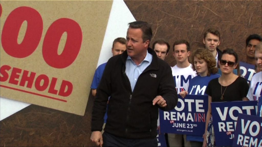 【now新聞台】還有不到六周,英國會舉行脫歐公投。支持和反對的陣營趁在周末舉行多場活動拉票。英國首相卡梅倫警告脫歐可能令英國經濟衰退,每個家庭可能要付出4300英鎊的代價。