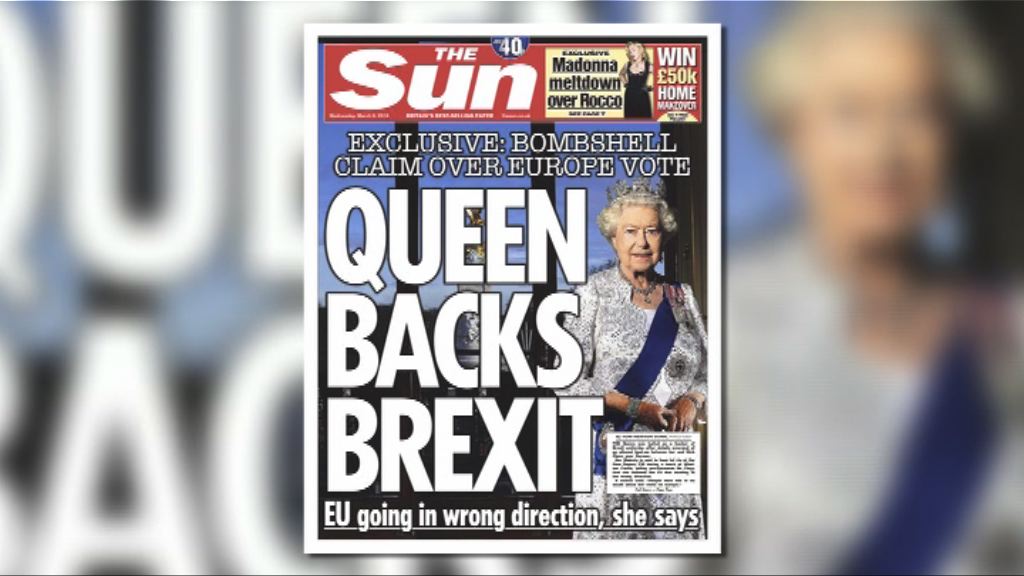 【now新聞台】英國有報章報道英女王支持英國脫離歐盟,指她在五年前曾向時任副首相克萊格批評歐盟。白金漢宮指報道是虛構,強調女王一貫保持政治中立,克萊格亦批評報道荒謬。