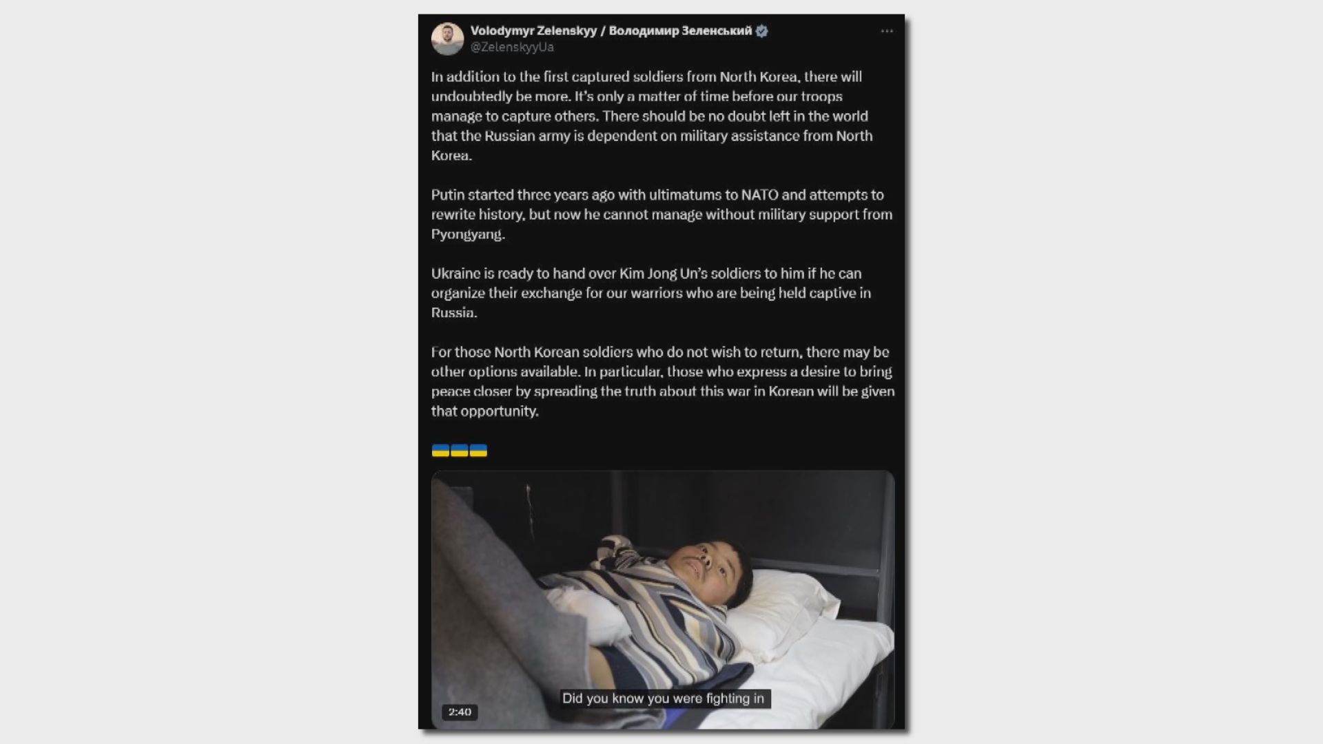 【Now新聞台】烏克蘭再公布早前被擄的北韓士兵片段,他交代自己被烏軍抓獲前的經過,又指曾受訓指示他遇上平民和投降烏軍時用畫圖來溝通。烏克蘭總統澤連斯基批評俄羅斯藉朝兵拖延戰爭。