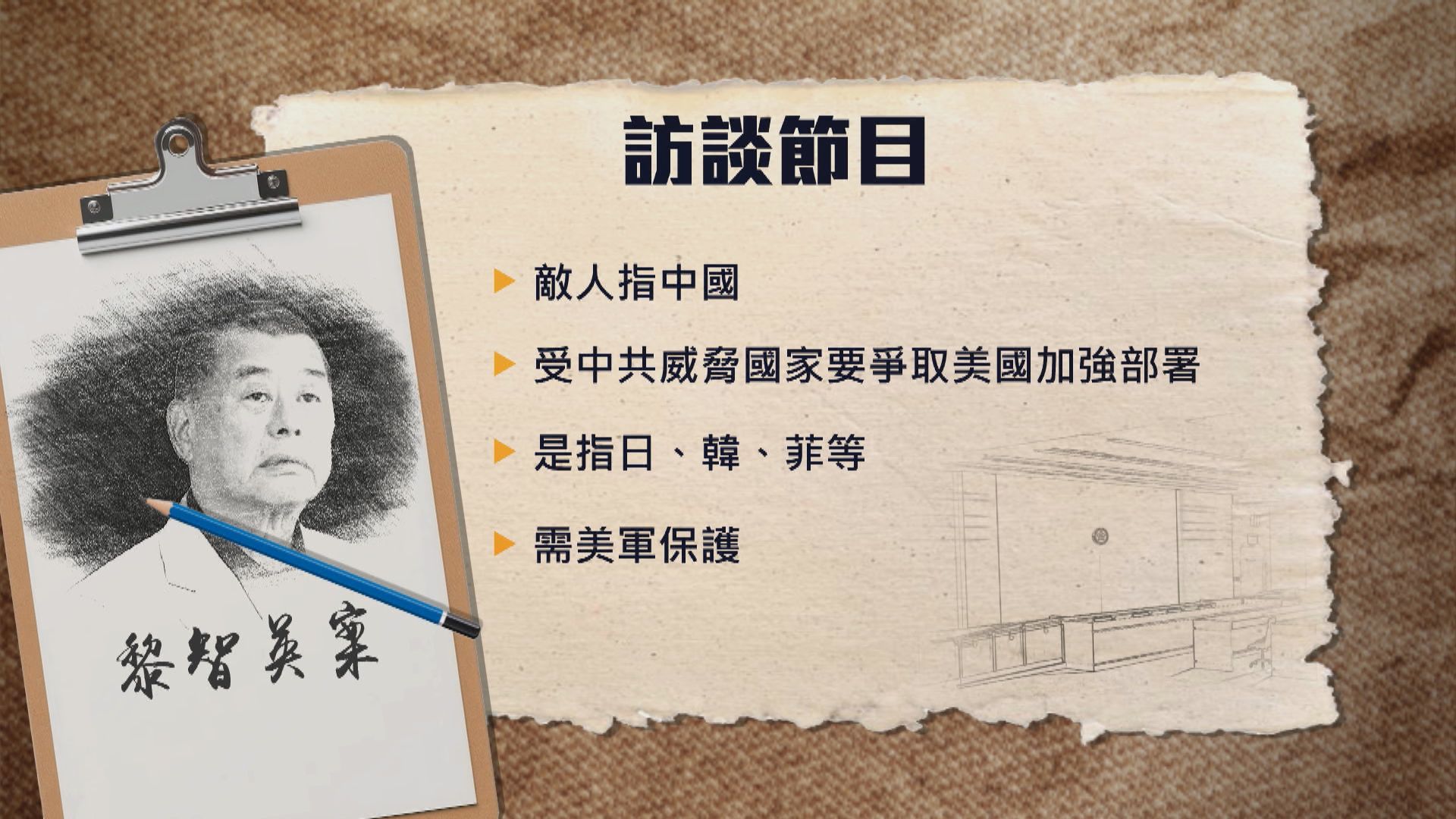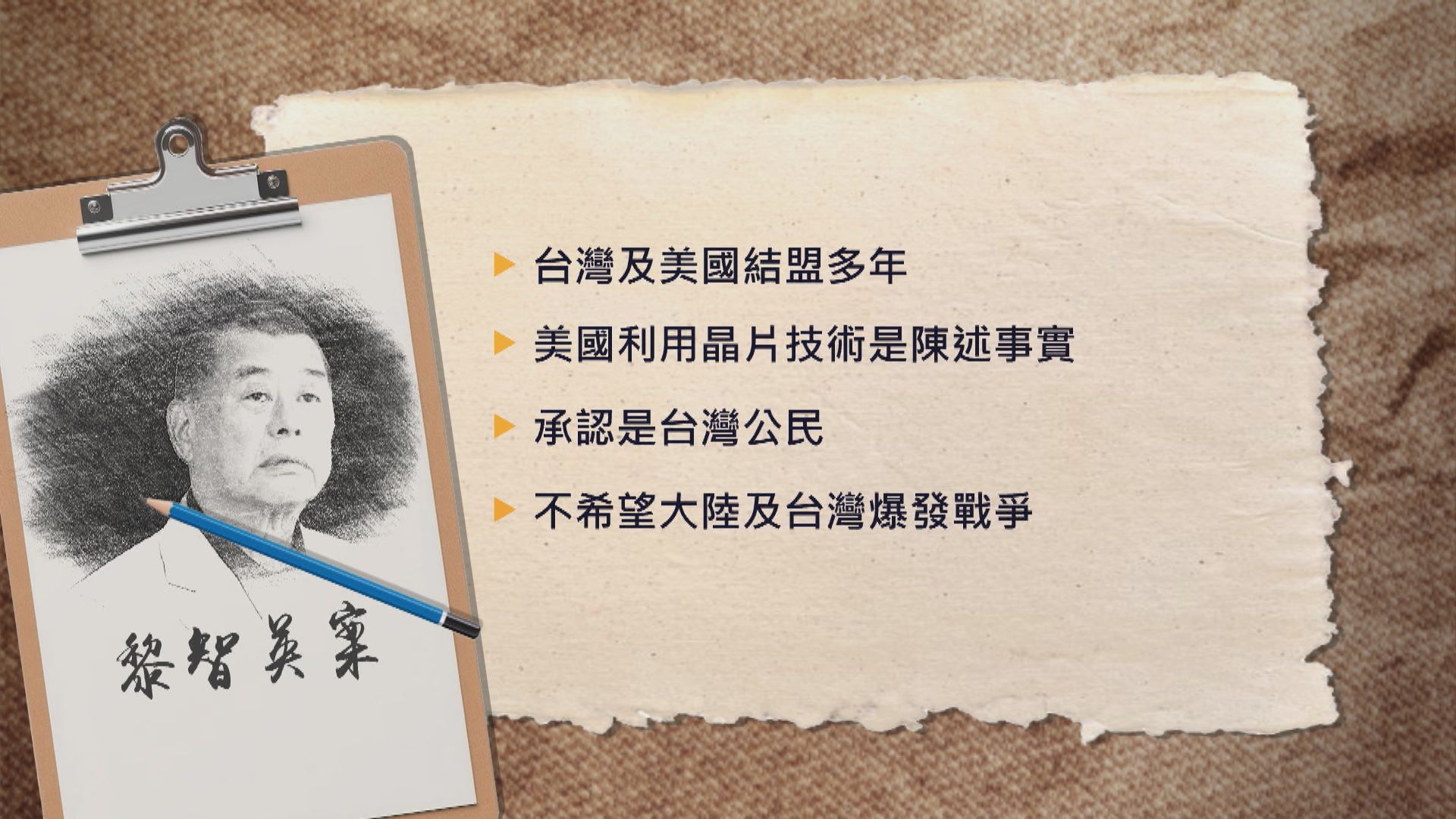 【Now新聞台】黎智英案續審,黎智英指,認為台灣跟日本應在軍事上建立更緊密結盟,才能保護台灣,但並非主張日台對中國採取敵對行動。