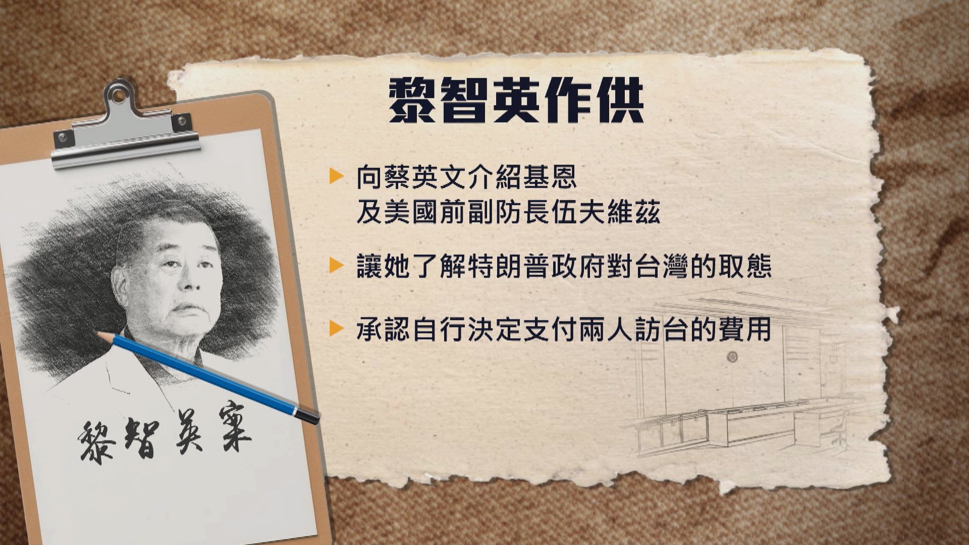 【Now新聞台】黎智英國安案續審,控方開始盤問。黎智英作供時承認自費安排美軍退役將領基恩與美國前副防長伍夫維茲到台灣與蔡英文會面,又否認曾與美國國安顧問博爾頓會面是作為中間人協調美軍駐台。