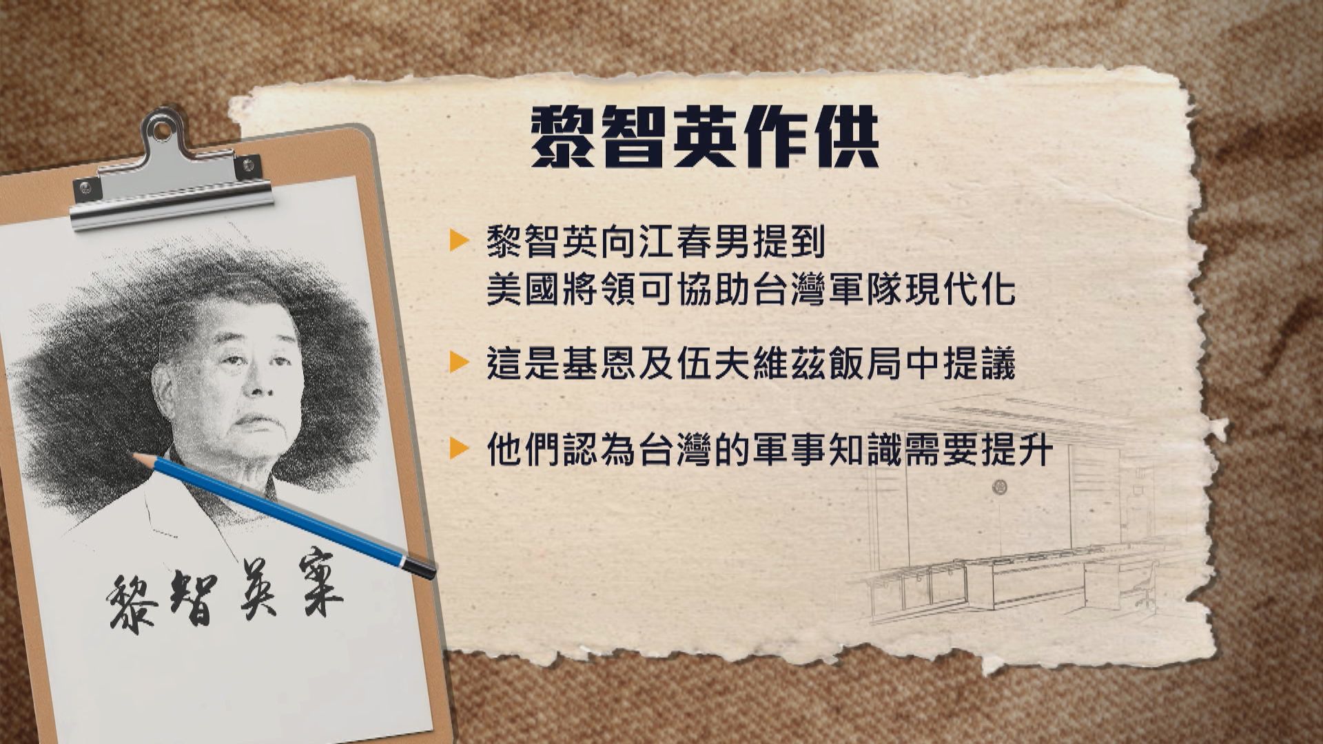 【Now新聞台】黎智英國安案續審,控方開始盤問。黎智英作供時承認,曾因為美軍退役將領基恩及美國前副防長伍夫維茲的意見,向台灣蔡英文的副手江春男提及美國將領可協助台灣軍隊現代化,希望江春男向蔡英文轉達。