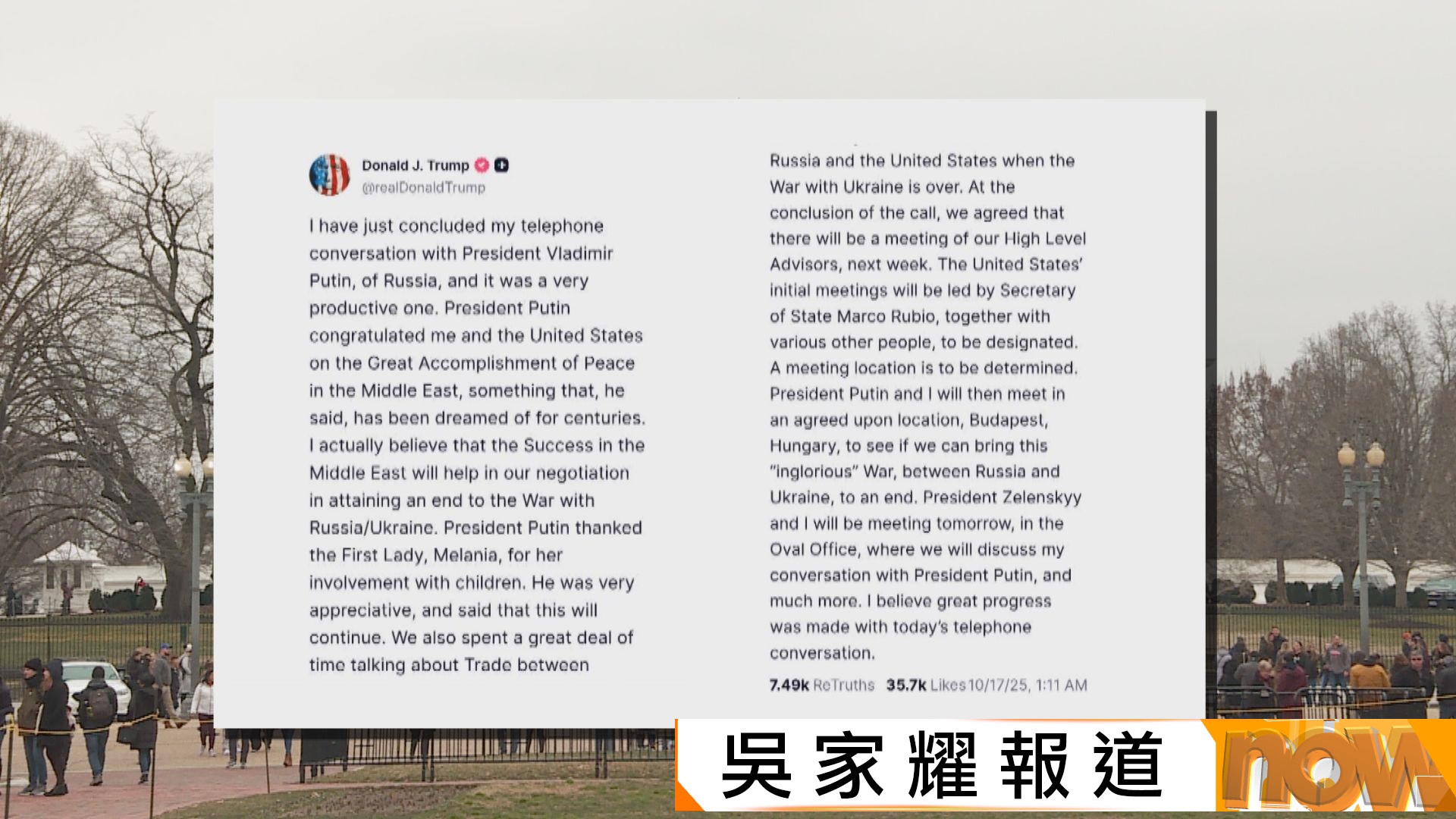 【Now新聞台】美國總統特朗普稱與俄羅斯總統普京通話,兩人會於匈牙利布達佩斯會面,討論終結俄烏戰事,但沒透露會面時間。