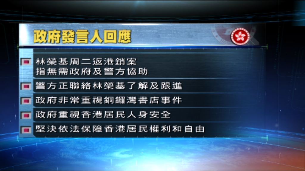 【now新聞台】政府發言人表示,留意到林榮基講述去年離港後於深圳被拘留。而林榮基周二返港後,警方主動接觸他。林榮基當時要求銷案,並指不需政府或警方協助。警方正主動聯絡林榮基,了解事件並作適當跟進。