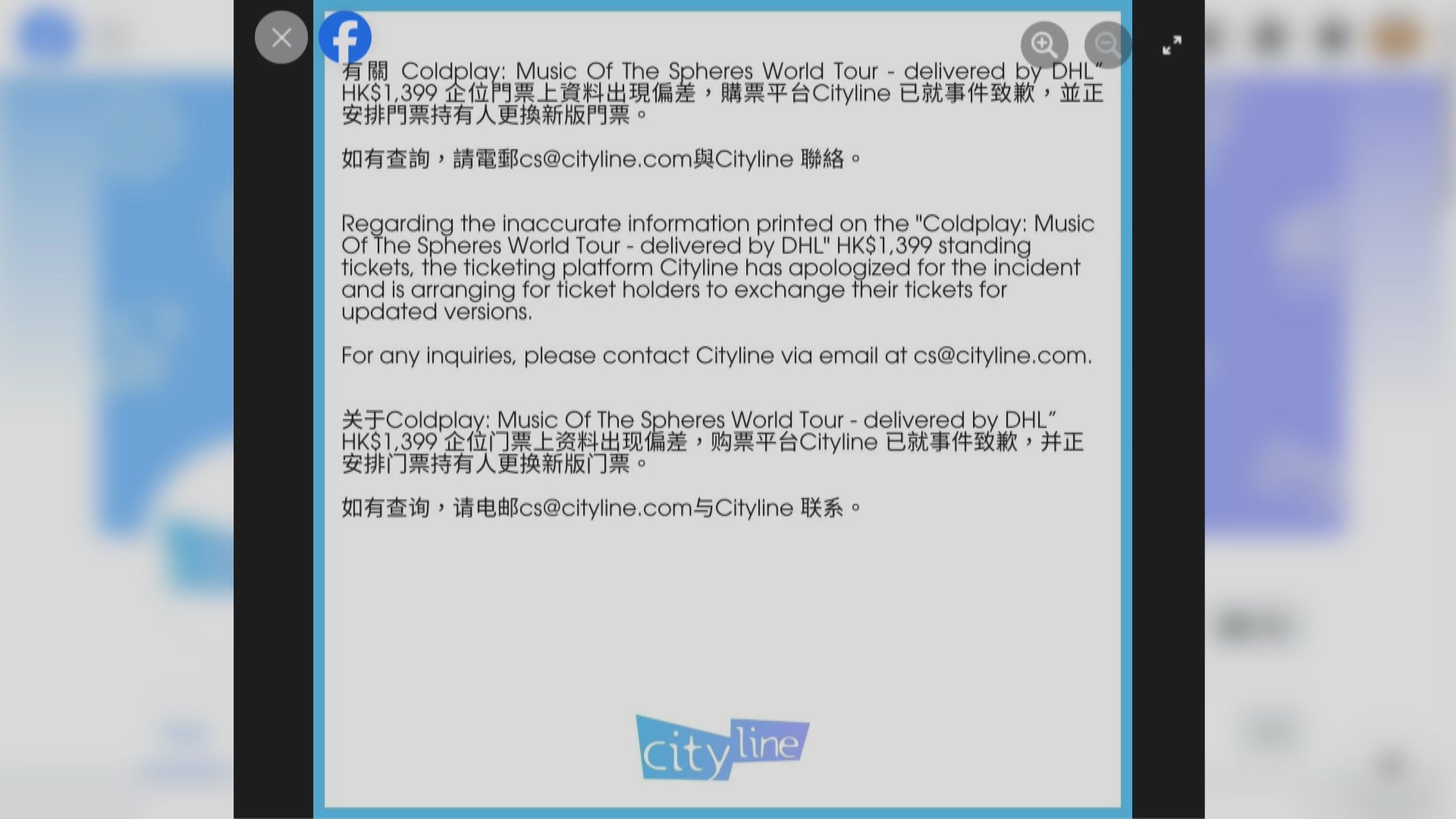 【Now新聞台】英國著名樂隊Coldplay下月於啟德體育園開演唱會,但有歌迷接獲通知印錯門票,要求他們在舉行前兩周到本港指定地方更換。截至周六晚七時,消委會接獲17宗相關投訴。售票網Cityline致歉,並在晚上新增內地換票地點。