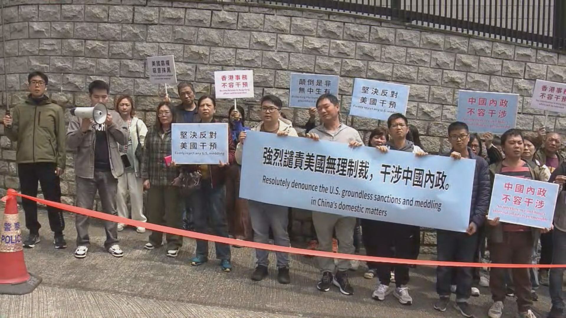 【Now新聞台】外交部駐港公署強烈譴責及堅決反對有關制裁,強調美國干涉香港事務及中國內政注定失敗,中方必將採取措施堅決反制。多個團體亦到美國駐港總領事館抗議。