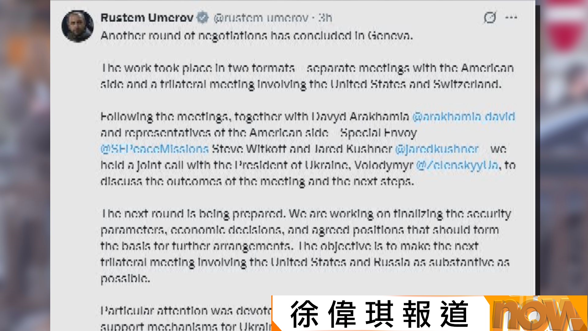 【Now新聞台】美國官員在瑞士分別與烏克蘭及俄羅斯談判代表會晤,為舉行下一輪的美俄烏三方會談做準備。烏克蘭總統澤連斯基表示,各方已做好充分準備,下一輪談判可能會於下月在阿聯酋首都阿布扎比舉行。