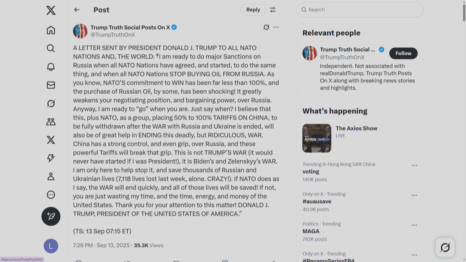 【Now新聞台】美國總統特朗普聲稱已準備好對俄羅斯再實施重大制裁,正等待北約加入,他又要求所有北約成員國停止購買俄羅斯石油,並對中國加徵50%至100%關稅,認為措施有助終結俄烏戰事。