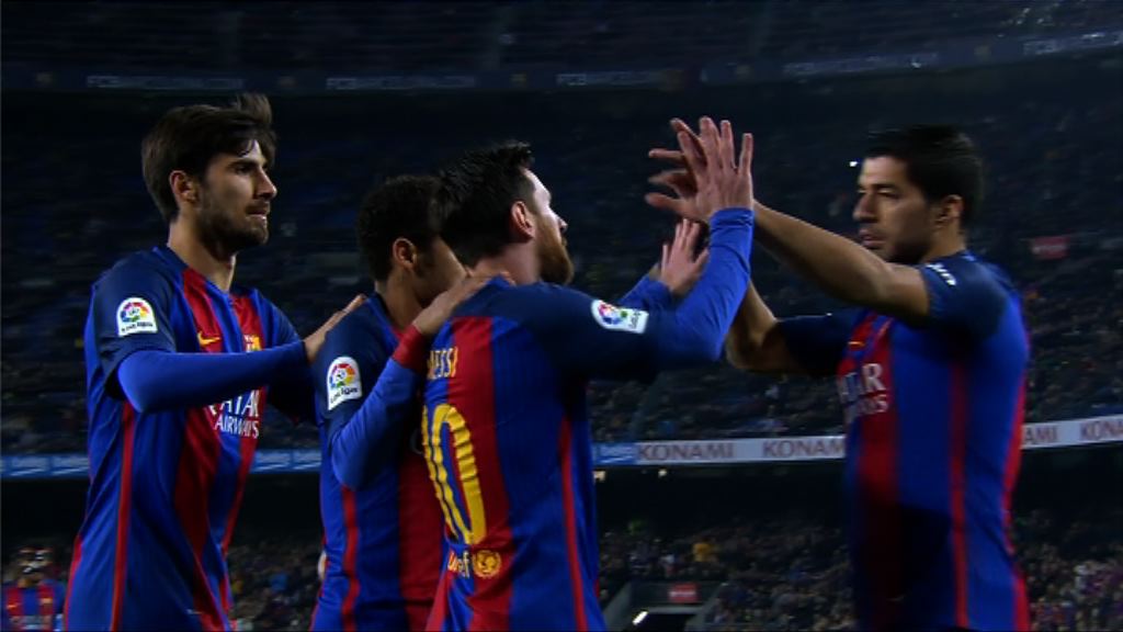 【Now新聞台】西班牙甲組足球聯賽,巴塞羅那主場2比1擊敗雷加利斯,排第二位,落後榜首的皇馬一分,但踢多兩場。