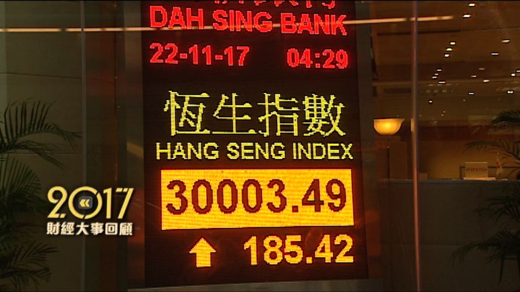 【Now新聞台】本港股市2017年氣勢如虹,恒生指數由22000點以下起步,即使環球各大央行部署「收水」,仍無阻恒指一度升上近30200點的十年高位。雖然恒指未能企穩於30000點以上,但至今仍升逾7000點,大升逾30%,是自2009年以來最大升幅,表現更冠絕全球...
