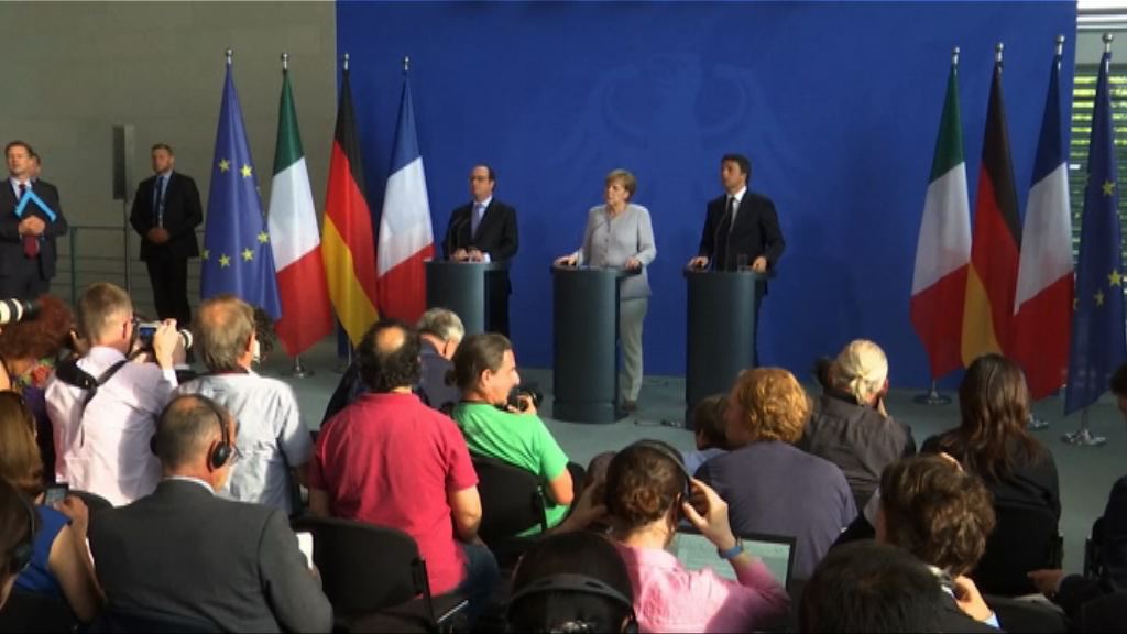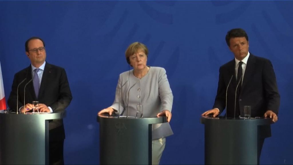 【now新聞台】英國脫歐令歐盟陷入危機,德國、法國和意大利的領袖會晤,商討如何應對英國脫歐。德國總理默克爾在她所屬政黨的會議上提出,要採取措施,防止再有國家脫離歐盟。