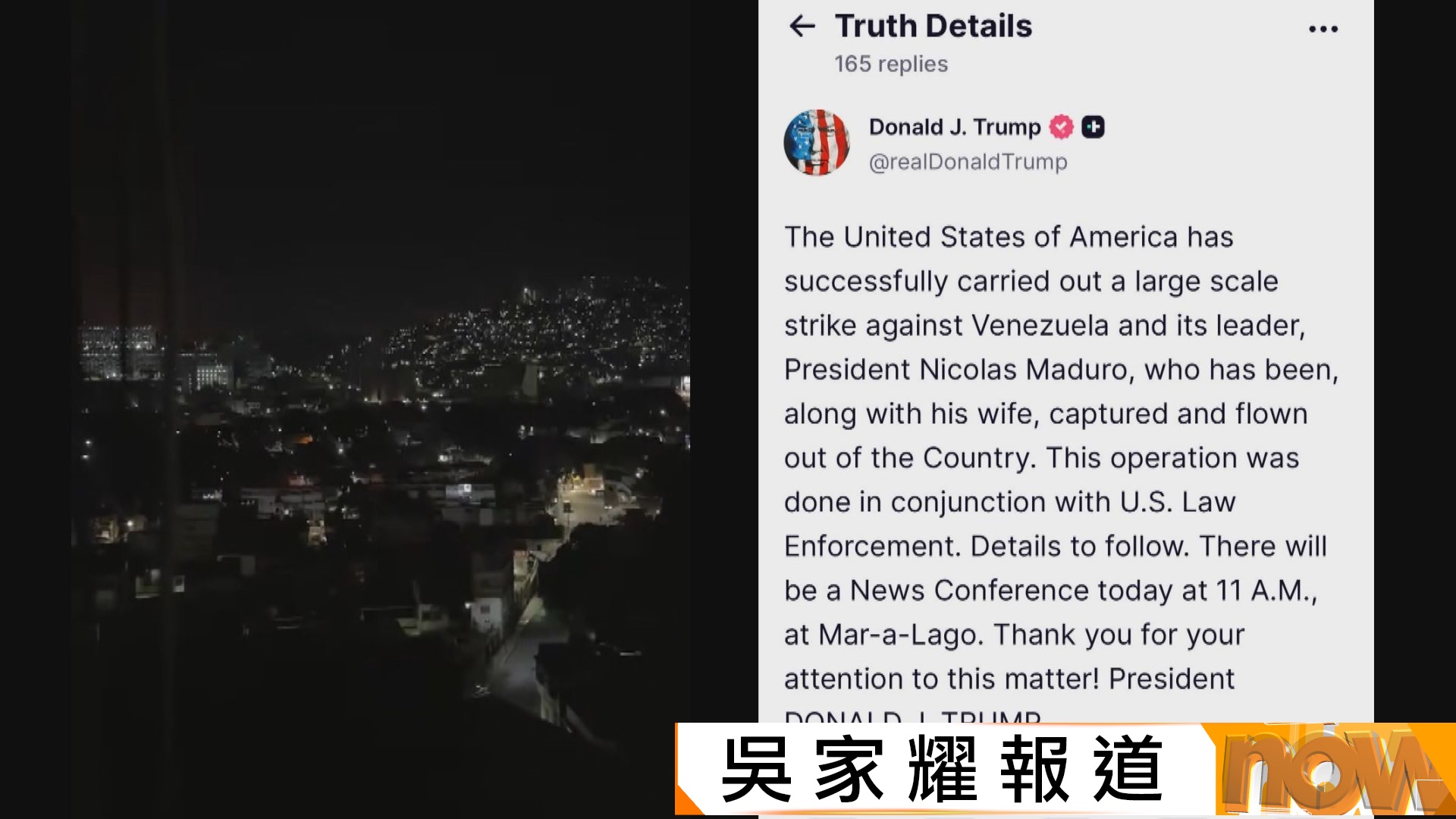 【Now新聞台】美國派出特種部隊突襲委內瑞拉,生擒總統馬杜羅夫婦,並將兩人押送到美國,預料周一出庭。美國總統特朗普稱會暫時接管委內瑞拉,直至安全過渡。