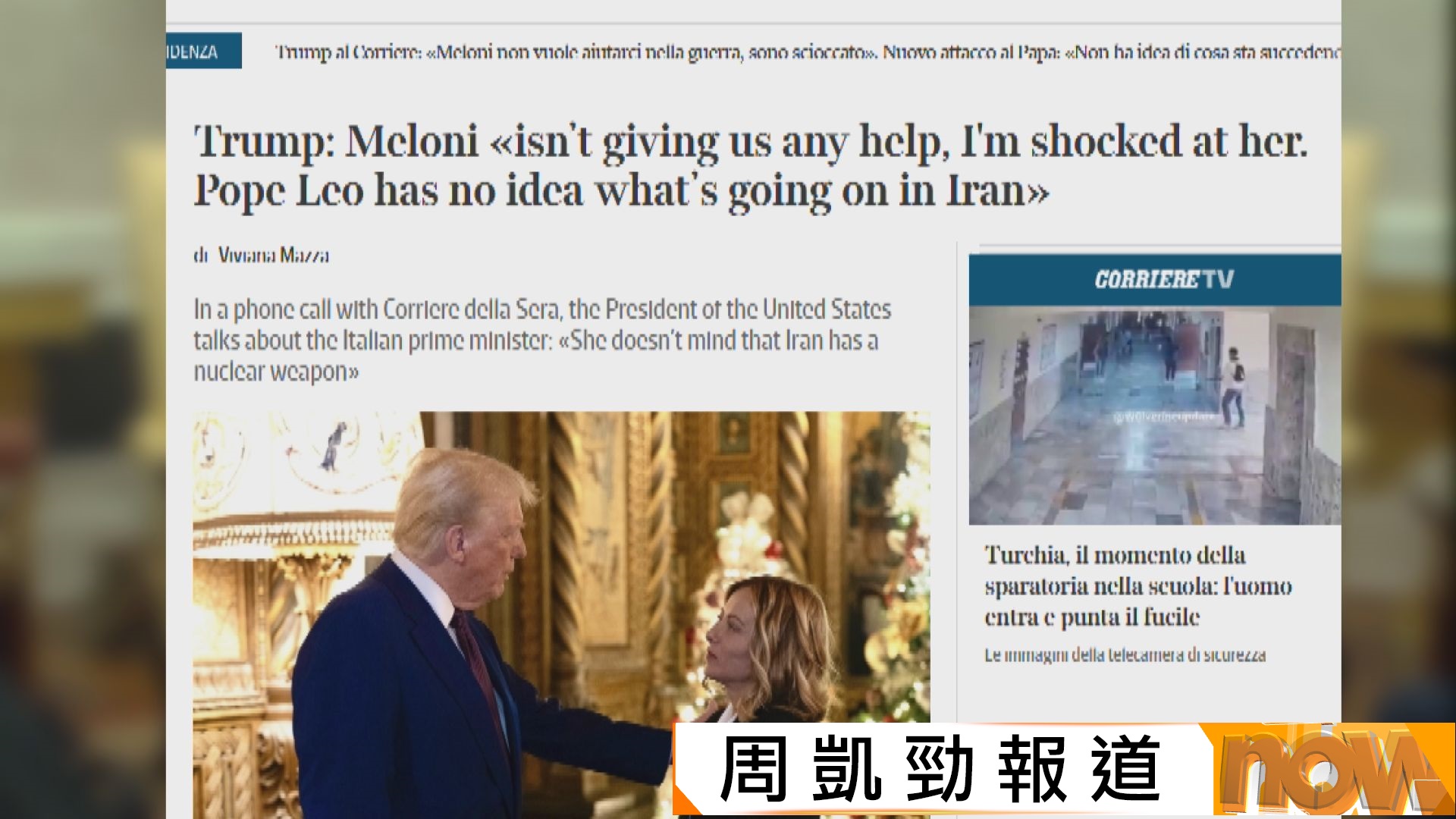 【Now新聞台】美國總統特朗普批評意大利總理梅洛尼,指對方表明不會在伊朗戰事幫助美國,他對此感到震驚,又形容對方缺乏勇氣。梅洛尼反駁特朗普的批評,指不同意盟友所為時,必須有勇氣表明。