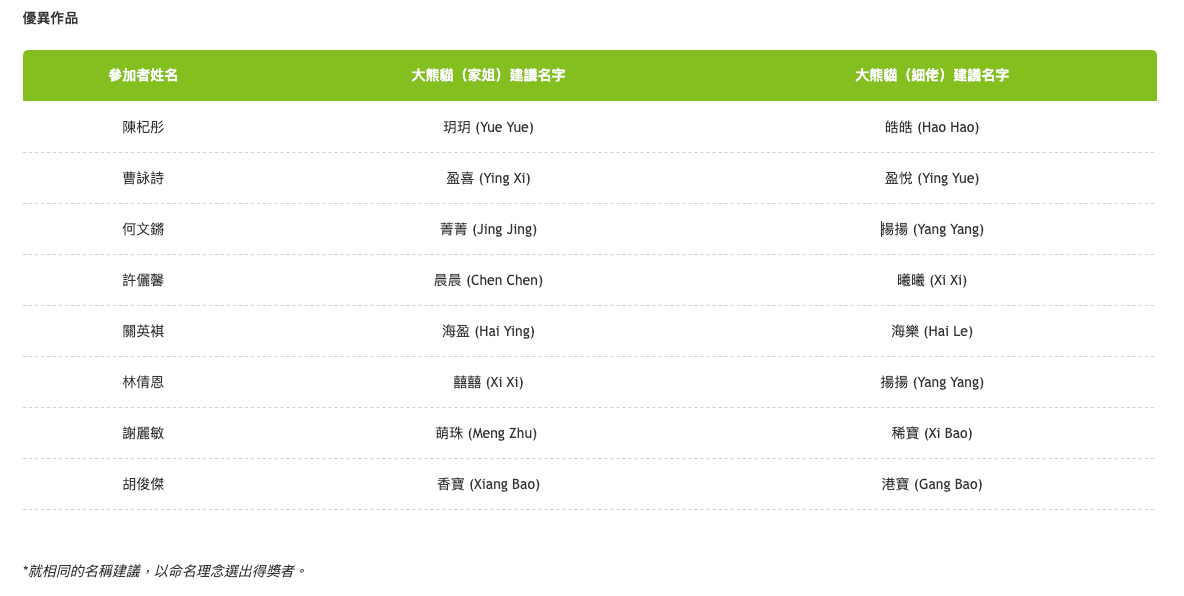 除了獲勝的名字「加加」、「得得」外,比賽也選出了8組優異作品,包括「玥玥 (Yue Yue)、皓皓 (Hao Hao)」;「盈喜 (Ying Xi)、盈悅 (Ying Yue)」;「香寶 (Xiang Bao)、港寶 (Gang Bao)」、「萌珠 (Meng Zhu) 、稀寶 (Xi Bao)」等。