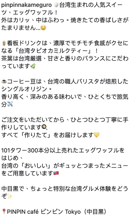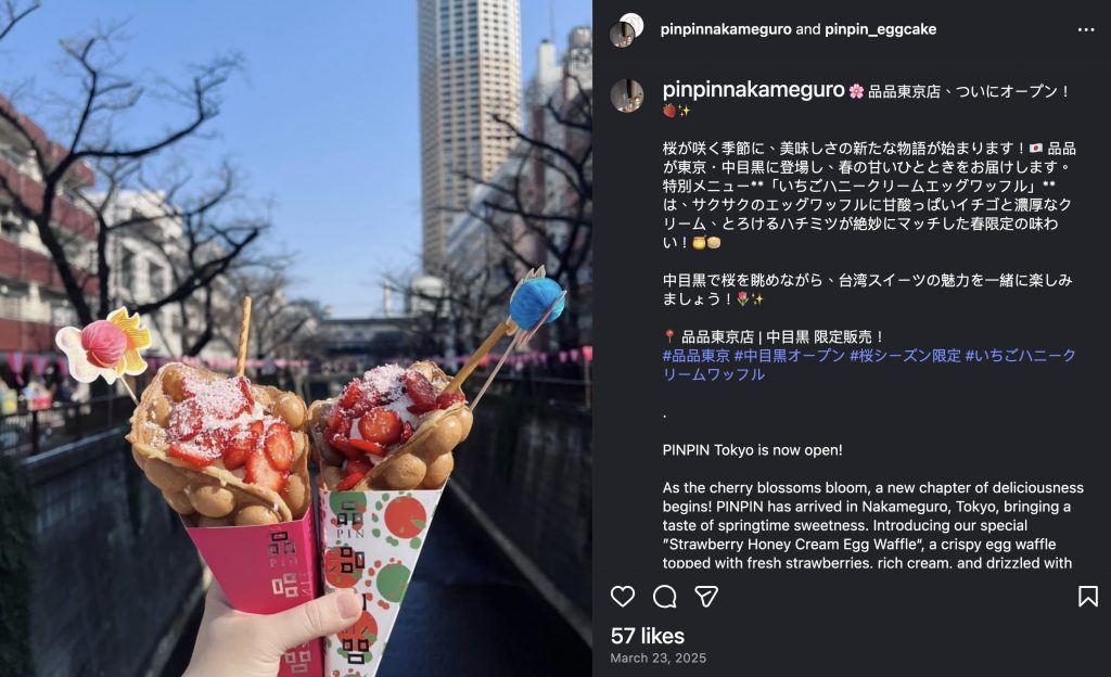 來自台灣的Cafe「品品Cafe」,主打雞蛋仔、台式茶飲和咖啡,於台灣有3間分店。最近品牌就在日本東京目黑開設首間海外分店,並接受了當地電視台訪問。訪問於電視節目「かのサンド」播出,店員向節目主持人表示他們來自台灣,並請主持人喝台灣的無糖茶。
