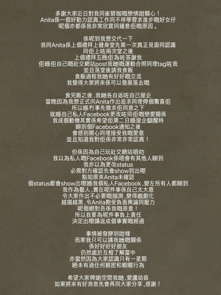 【Now.com】大隻Rocky鄭健樂早前在Facebook高調將感情狀況轉為「與Anita Chui戀愛中」,但崔碧珈Anita早前接受訪問時回應指兩人的關係並非情侶,而是「好好好好嘅朋友」。今日Rocky終於在Facebook發文回應事件,指是自己不了解社交媒體的操作導致的誤會,表示顯示兩人的關係是「好好好好朋友」。