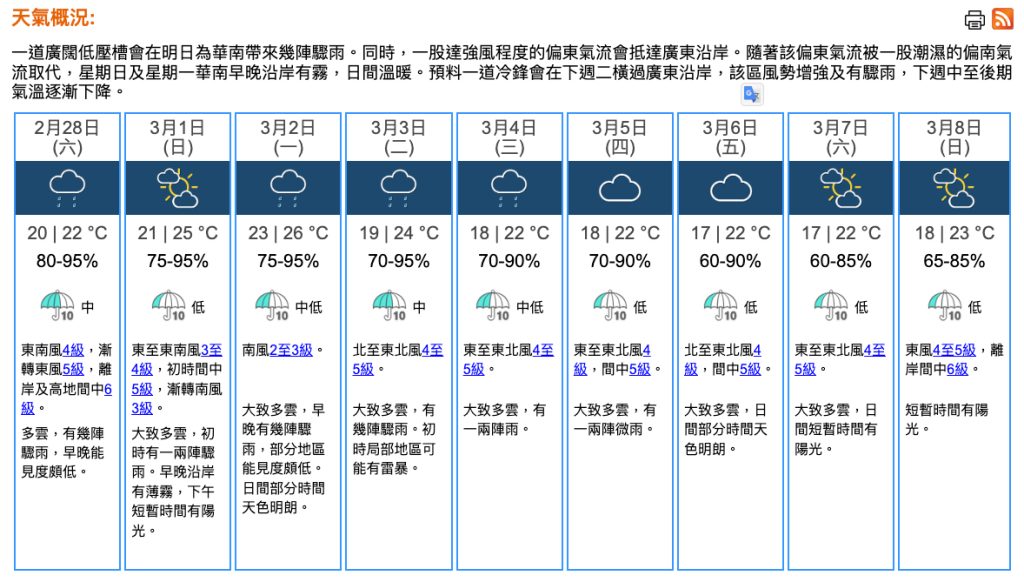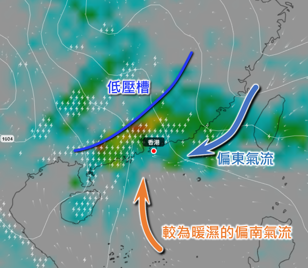 天文台預測,明日(28日)多雲,有幾陣驟雨,初時驟雨較多,氣溫介乎20至22度,相對濕度百分之80至95。天文台科學主任在網誌「天氣隨筆」中指出,一股偏東氣流將在明日逐漸影響廣東沿岸,並在珠江口一帶與較暖濕的偏南氣流相遇,形成「輻合區」。兩股氣團匯聚會強迫氣流抬升,有利對流及降雨發展,有機會為香港帶來本年度首場較為顯著的降雨。