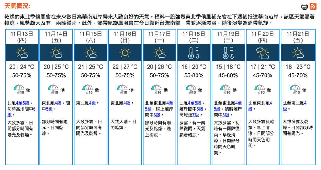 據天文台最新九天天氣預報,本港周末天氣大致良好,日間溫暖,市區最高氣溫可達27度。下周一(17日)風力開始增強,吹北至東北風4至5級,晚上離岸間中6級,早晚稍涼。至周二(18日)清晨天氣顯著轉涼,有一兩陣微雨。市區最低氣溫急跌至16度,新界多區低見14度,打鼓嶺更料將跌至13度。周三氣溫將進一步下跌,市區清晨僅15度,大埔、石崗等新界地區低見13度,打鼓嶺料跌至12度,料初時有一兩陣微雨。至下周四(11月20日)起氣溫才會稍微回升。