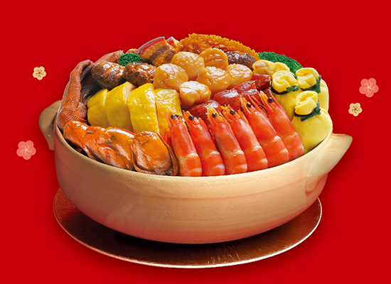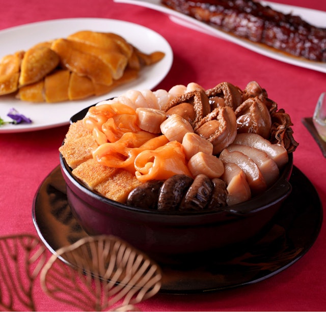 使用了16款食材包括原隻蠔皇鮑魚(6隻 /12隻)、花膠、海參、黃金福袋(6個)、茄汁中蝦(6隻)、蠔豉、花菇、南乳炆蓮藕、南乳炆腩仔、炸魚蛋、蠔菇、鵝掌、栗子、枝竹、蘿蔔及西蘭花。