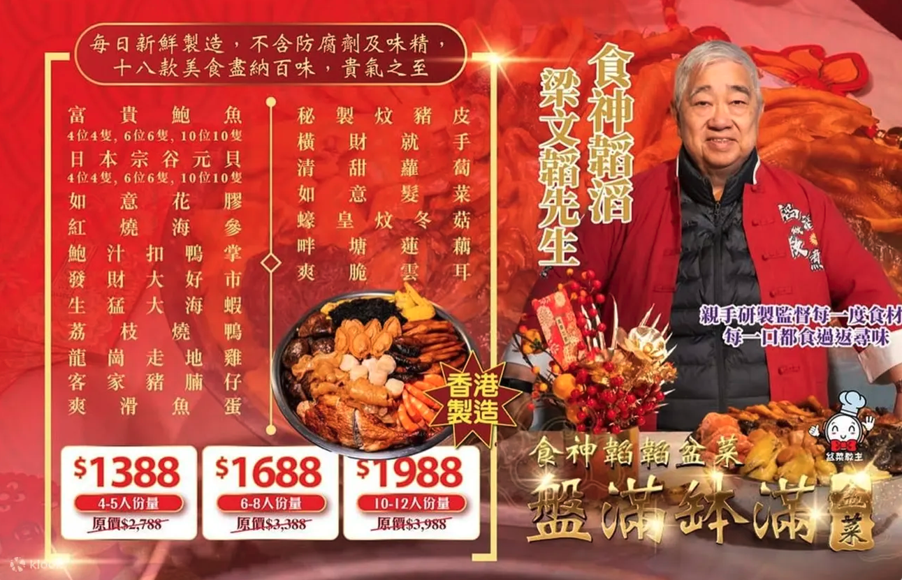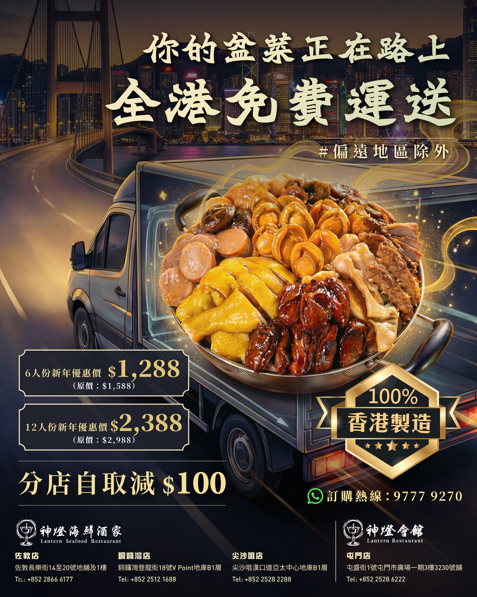 「神燈海味盆菜」主打10頭鮑魚、鮑汁花膠、日本宗谷元貝瓜脯、紅燒海參、蠔豉、蠔汁扣鵝掌等頂級食材,最多可供12人享用,現時更有低至79折優惠,以及外賣直送免運費服務,直送到港九新界及東涌,甚至村屋。