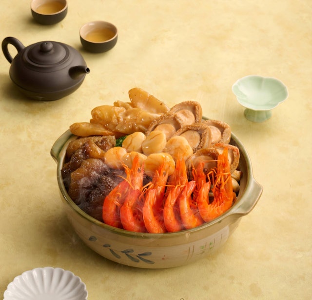 明閣新春一品煲 (四位用)材料包括聯記號原隻鮑魚(6頭)、花膠、流浮山金蠔、瑤柱、海參、海蝦、燒腩肉、豬手、鯪魚球、枝竹、花菇、水雲、本地蘿蔔、蓮藕、生菜。(以可循環再用的砂鍋奉上,並可以明火或電磁爐加熱)