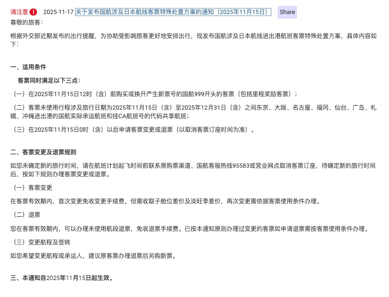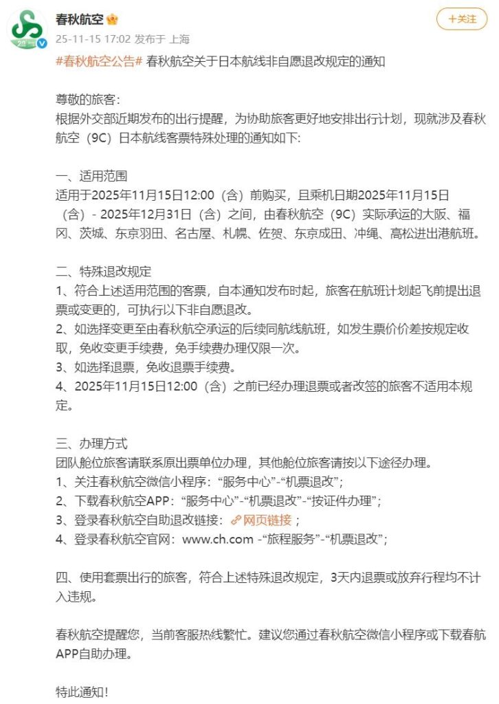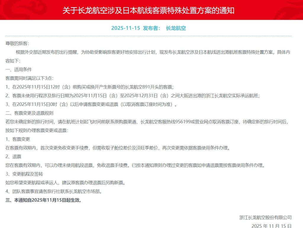 據內地民航資源網報道,至今共14間內地航空公司相繼發布日本航線機票相關通知,包括中國國航、東方航空、南方航空、四川航空、廈門航空、海南航空、春秋航空、天津航空、吉祥航空、深圳航空、山東航空、九元航空、長龍航空及首都航空。根據各航空公司公布的細則,目前免費退款及更改的適用範圍為:2025年11月15日中午12時前購買,出發日期在2025年11月15日至2025年12月31日期間的機票,往返機票皆可適用。不過,在11月15日中午12時前已辦理退票或更改的旅客不適用此規定。