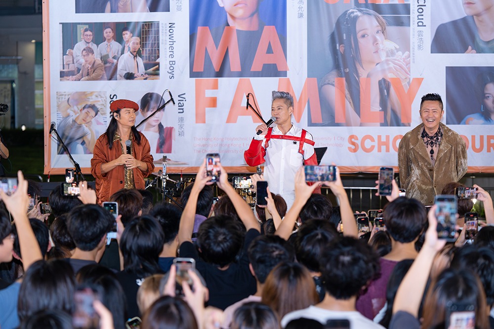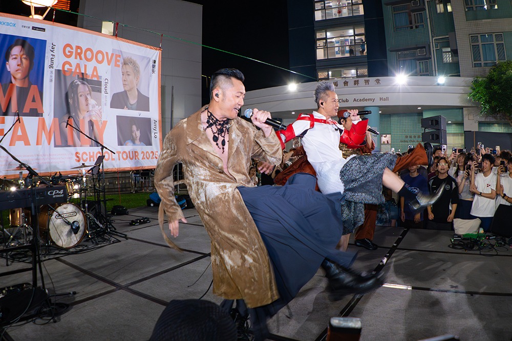 寰亞音樂年度活動「GROOVE GALA MA FAMILY SCHOOL TOUR」近日啟動,今年演出陣容包括馮允謙(Jay)、陳健安、黃淑蔓(Feanna)、雲浩影(Cloud)、樂隊Nowhereboys及新人盧慧敏(Amy Lo)等。其中在城市大學站的演出,更有「元祖級男團」草蜢特別演出。首次參與School Tour的草蜢表示感覺新鮮刺激。草蜢以《華麗舞台》打頭陣,台下學生們跟住唱,企第一排觀眾更緊貼舞台零距離。蔡一智說:「今日CityU嘅同學仔突破咗紅館第一行觀眾,因為依家紅館第一行都未必握到手。今日真係好近,一伸手就掂到!」他們邊說邊圍繞舞台與同學們握手和擊掌。
