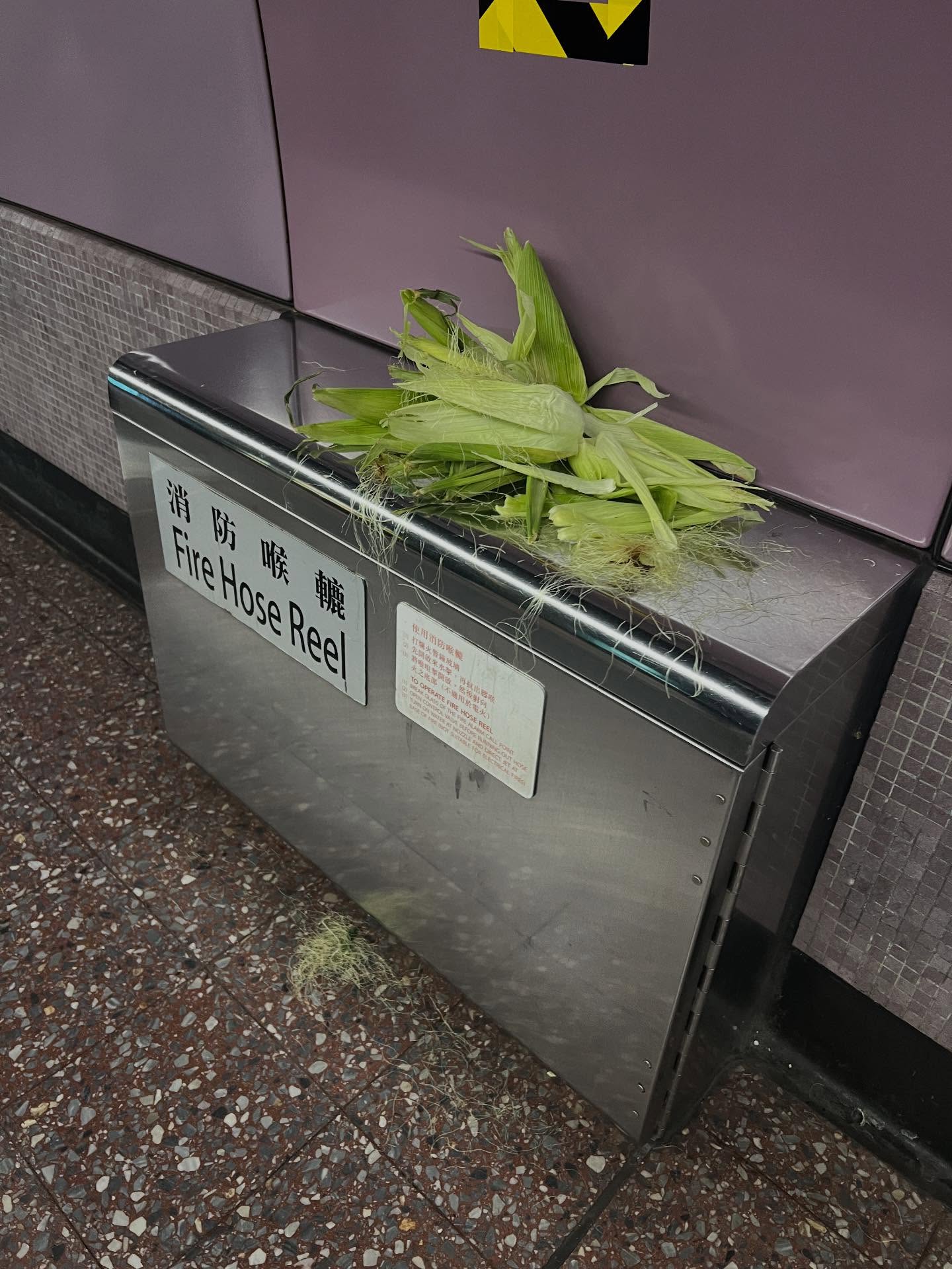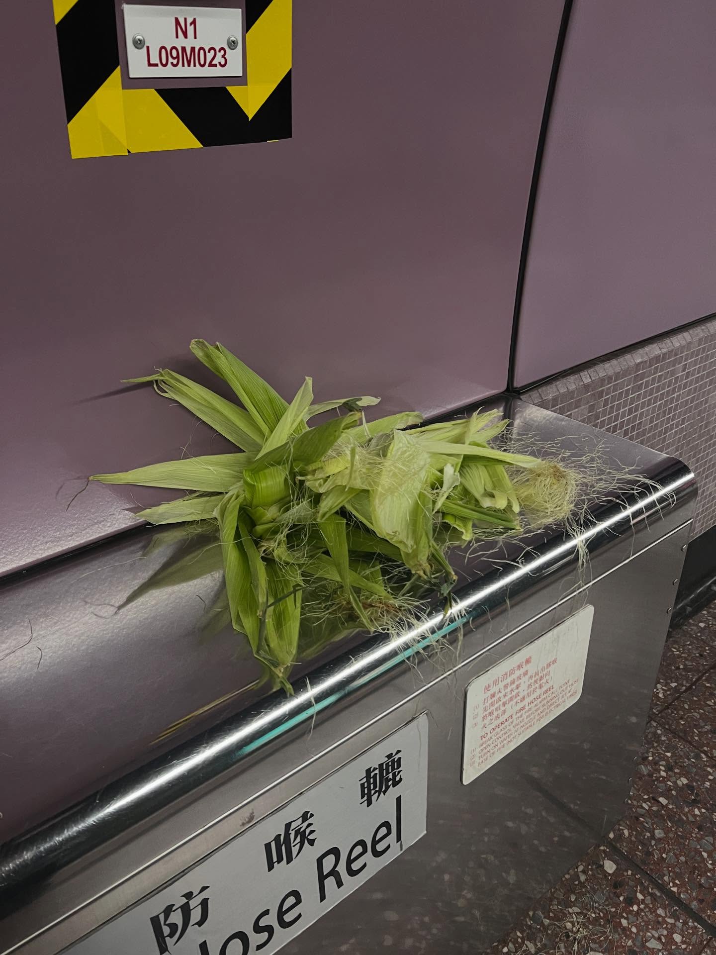 樓主前日(23日)在社交平台Threads以「公德心」為題上載相片發帖,留言稱「到底有幾趕唔可以等到返屋企要喺地鐵站搣粟米???」。相中所見消防喉轆頂上,堆放了粟米衣和粟米鬚,部分粟米鬚更散落地上。