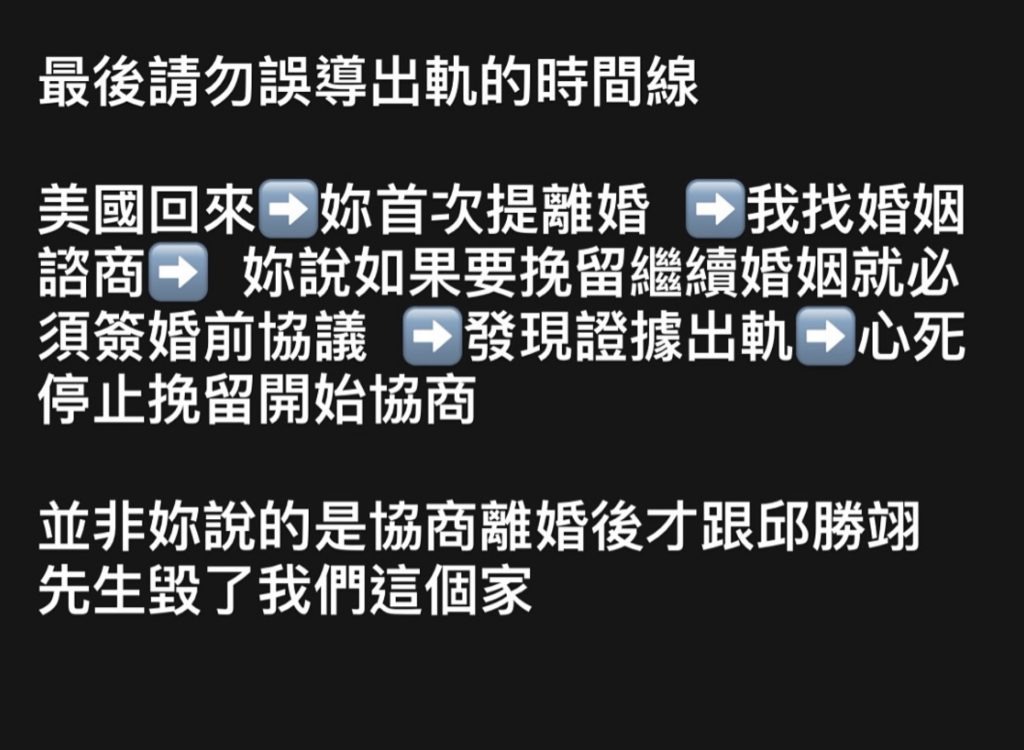 至於被指控出軌王子的事情,粿粿表示她「在情緒脆弱時與邱先生越走越近」,並向范姜彥豐與女兒致歉。但粿粿強調離婚的事件和出軌無關,亦和與王子共赴美國旅遊的事情無關。