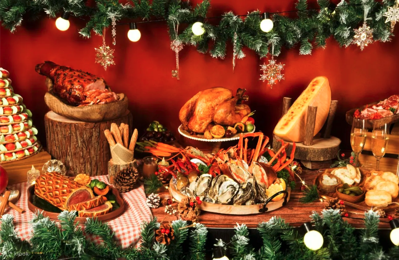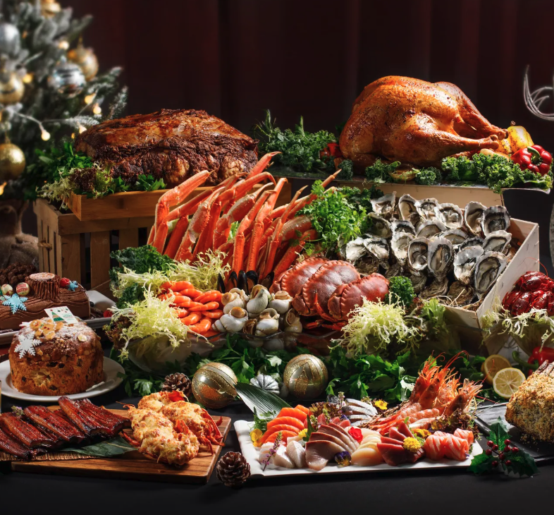 今年「節日歡騰海鮮」自助餐提供即開生蠔、龍蝦、雪花蟹腳和麵包蟹等海鮮凍盤;刺身則有日本油甘魚、阿根廷紅蝦、北海道帶子等。平安夜及聖誕節正日(12月24及25日)將限定供應日式佐賀黑毛和牛火鍋。