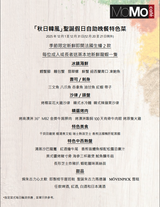 沙田萬怡酒店MoMo Cafe自助餐以性價比高見稱,今年聖誕推出「秋日韓風」聖誕假日自助餐,現時預訂晚餐可享低至5折優惠,每位只需$443起即可任食生蠔 、法國鴨肝、即蒸新鮮本地龍蝦等,價格非常親民。