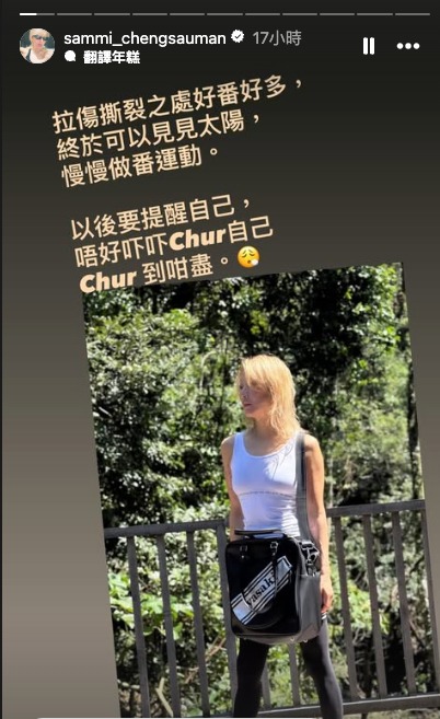 Sammi又提及目前傷勢好轉:「當時雖痛,但我是行到的,不過去照MRI的地方太遠,所以護士建議我這段路用輪椅輔助。至今在家靜心休息咗十幾日,一些行程也只能全取消。這三兩日,後腰痊愈好多好多了。終可回復返好多正常活動。慢慢做返些許運動。」最後Sammi指會重新投入準備與張敬軒的合作演唱會,又提醒自己人生難免有意外,「唔好再時時chur到自己咁盡」,以後要更謹慎。