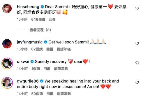 不少圈中人及粉絲都留言,祝福Sammi早日康復,即將與Sammi合作的軒仔留言:「Dear Sammi,唔好擔心,,健康第一。要休息好, 同埋食返多啲嘢呀。」而馮允謙、鄧麗欣、王君馨等亦為Sammi打氣。