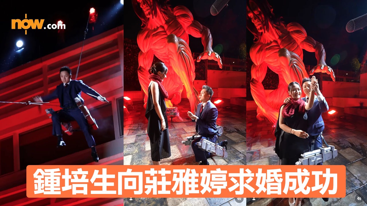 求婚影片所見,鍾培生在淺水灣鍾家大宅內佈置《進擊的巨人》場景、現場設管弦樂團伴奏,並化身「進撃的培生」,由約30米的高空吊威也一躍而下。